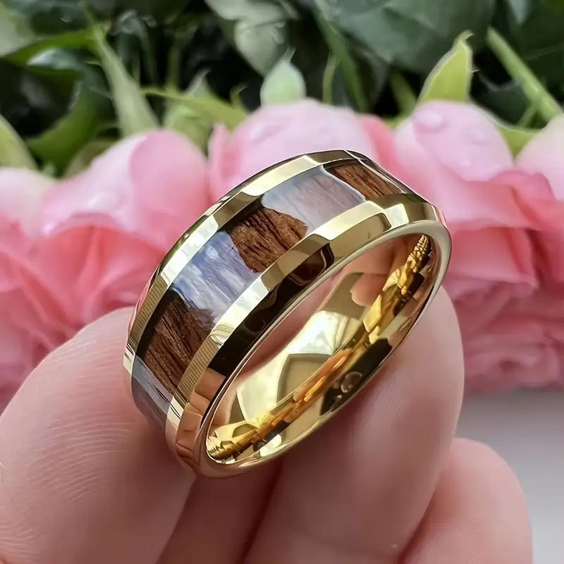 Expertly crafted from golden Tungsten, this 8mm band ring boasts a unique inlaid Koa wood design. Durable, comfortable, and unisex, it offers a luxurious look and feel perfect for engagements and weddings. Upgrade your fashion game with this fashionable piece of jewelry.